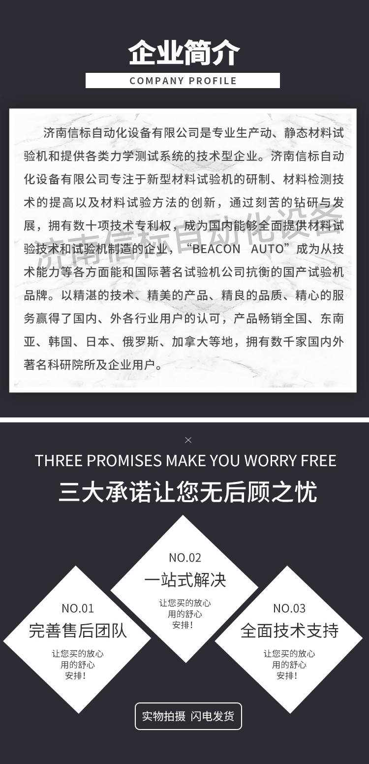 济南信标自动化设备有限公司主要生产:动静态万能疲劳试验机,接骨板弯曲试验机,缝合线拉伸疲劳试验机,髋膝关节磨损试验机,电子万能试验机、液压万能试验机、岩石三轴、四轴,电液拉力试验机,材料试验机,高低温蠕变,高低频疲劳,拉伸、扭转、杯突等二十多个系列两千多个的品种。